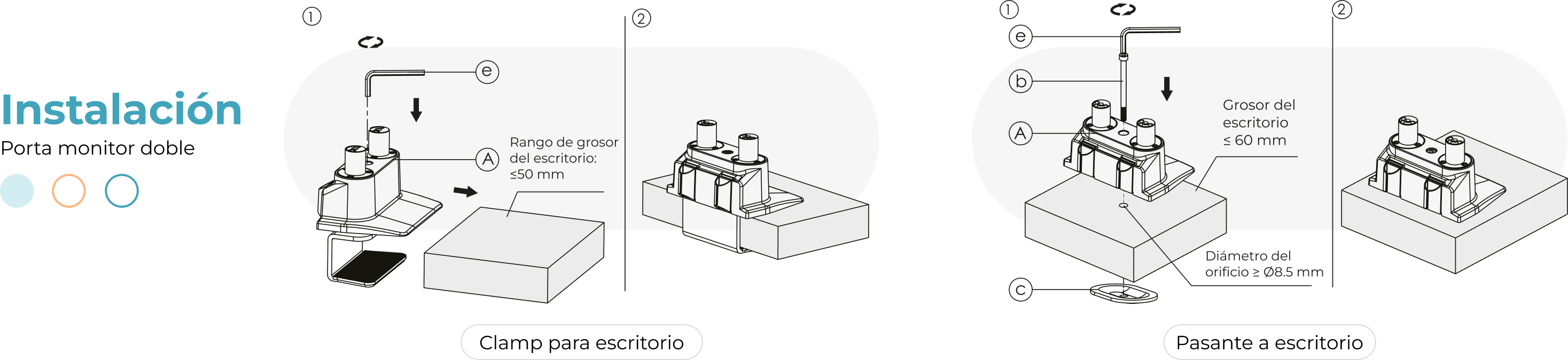 Por cada brazo: - Medida de monitor: <30" - Rango de peso: 2–10 kg - Montaje VESA: 75×75 / 100×100 - Inclinación: +75° a -30° - Giro: ±90° - Pivote: ±90° - Elevación: 340 mm